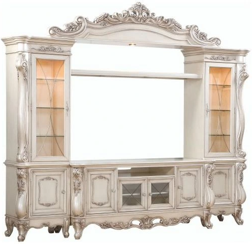 This sophisticated living room unit has matching case pieces including a center TV stand and large left and right facing piers with mirrored backs, ensuring plenty of unique storage and display space. The collection boasts of multiple glass doors and glass display shelves and an elegantly arched and lighted center bridge. This stylish and detailed piece is ideal for entertaining guests and will add elegance to any living room Decor.