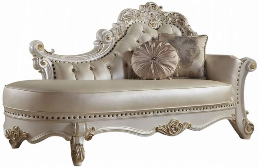 Tracing back to the classical Baroque era, expressed with intent and conviction, this Vendome chaise is donned in a pearl PU and an antique pearl finish that is richly accented with gold paint brushed onto the piece by hand.Read More