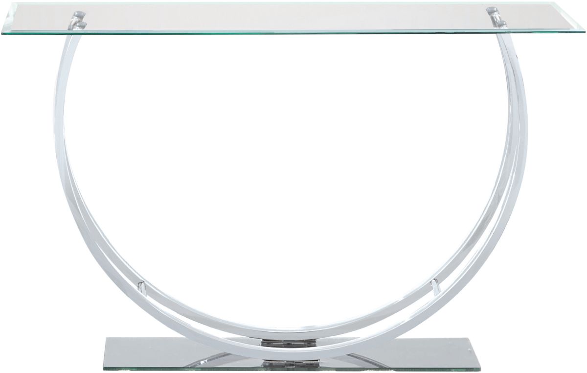 This impressive and lustrous sofa table combines flair with a unique design. The glass table top is a rectangle with handsome beveled edges. The chrome legs come in an eye-catching U-shaped design.Read More