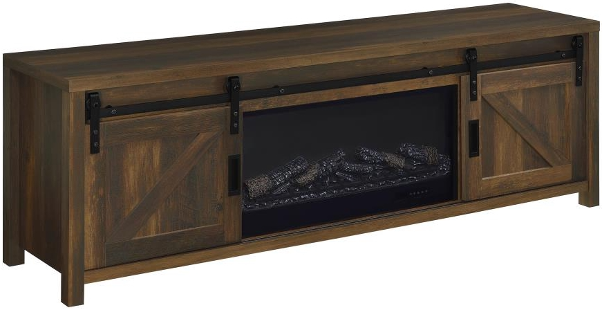 Fireplace TV stand in dark pine finish with black metal accents and sliding barn-style doors