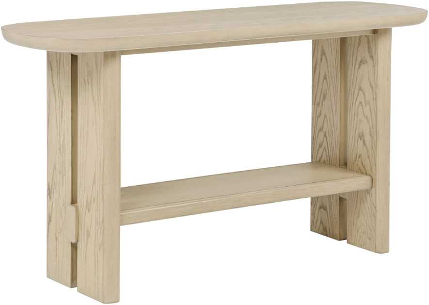 Console table with rectangular top and sculpted underside in beige oak veneer
