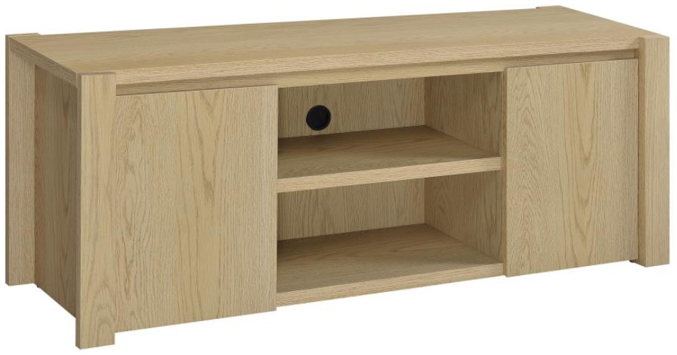 TV stand with open shelving and two hidden compartments in a light oak woodgrain finish