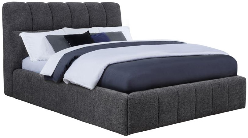 Tailored with bold lines and soft texture, this upholstered platform bed blends comfort with quiet strength. Vertical channel tufting runs along the headboard and foot rails, adding dimension and rhythm to the silhouette. Wrapped in plush fabric and fully slatted for support, it eliminates the need for a foundation. Crafted from solid and engineered wood, this bed invites modern serenity into any bedroom retreat.Read More