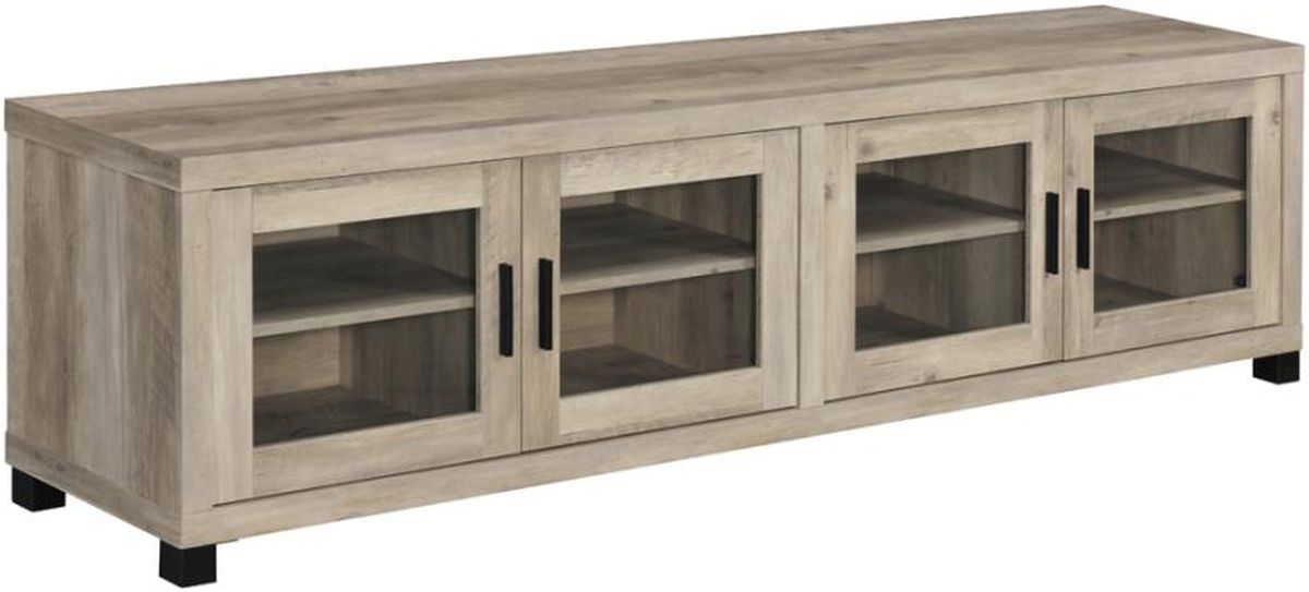 The boxy shape and smooth surfaces of this TV console offer a contemporary look and feel to any space. Double cabinet doors, each with glass doors, offer a way to showcase your entertainment setup and operate devices.Read More