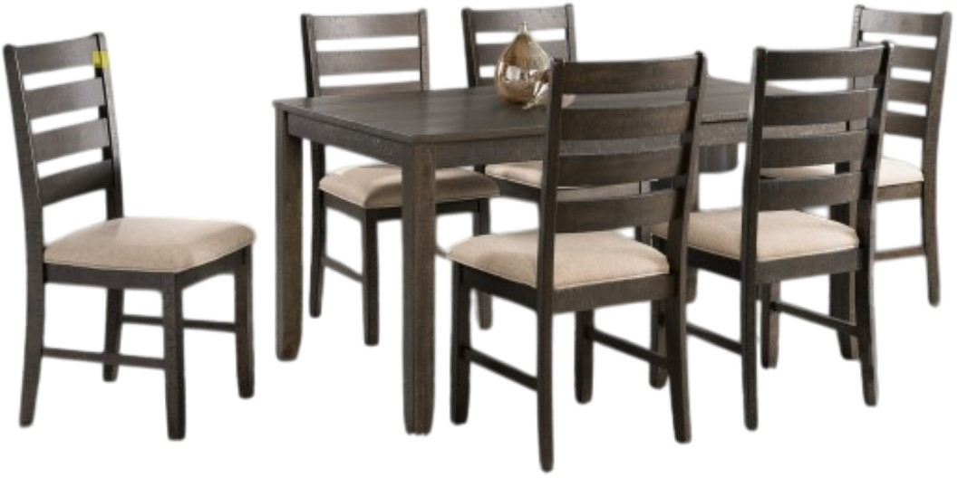 The clean lines are softened just enough with tapered legs for a sense of refinement. Upholstered ladder back chairs are a classic staple, while the comfortably cushioned seat brings a modern sensibility to the table. Engineered and solid wood table base and frame . Acacia veneer on table top . Tapered leg design . Saw machine distressing . Solid Acacia wood chair seat, legs and framing with plywood slats . Linen like upholstered seating . White plastic floor protectors on table and chairs