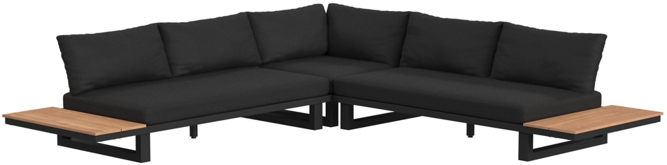 A bold skid base creates a unique silhouette and bolsters visual appeal, while the two slatted wood side tables are thoughtfully fashioned to prevent the pooling of water. Functional and refined, the cabana three-piece outdoor living set in black is poised to define your patio space with its adaptable style and quality construction.