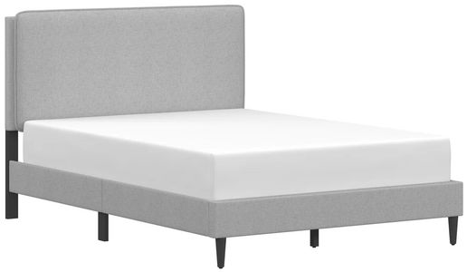Upholstered in a beautiful light gray, the bed contrasts nicely with the tapered black legs of the footboard to chic effect. This piece is designed in the modern casual style for a relaxed aesthetic and features welting around the pillow headboard for extra polish. A box spring isn’t required. Mattress required; not included. Assembly required.