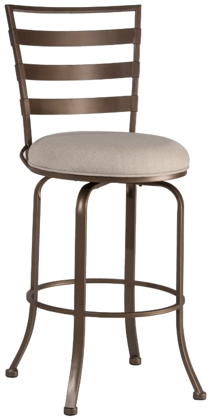 With this traditional commercial-grade metal bar height stool, you will be sitting in comfort and style. The warm brown metal frame supports a plush seat wrapped in beige fabric, and a wide, horizontal slat back offers the perfect spot to kick back and relax after a long day.Read More