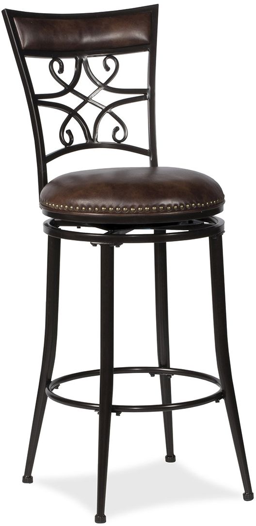 The stool features intricate metal work on the stool back and an upholstered padded seat and top rail.Read More