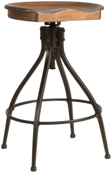 The contoured, solid birch seat features a distressed walnut finish and easily adjusts from counter height (26") to bar height (30")