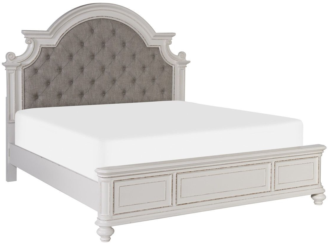 Soft, sweeping curves define the elegant profile of the Baylesford Collection. The California King bed is softened by an antique white rub-through finish creating a romantic aesthetic will place beautifully within your bedroom. Dark gray pleated, button-tufted fabric provides stunning contrast to the look of the bed.Read More