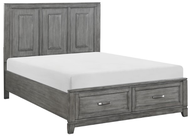 The Garretson Collection blends transitional lines with rustic styling to create an elegant addition for your bedroom. The distinct grain of the okume veneer features a gray finish. The queen bed features metal bar hardware on the picture frame drawer fronts of the low-profile storage footboard.Read More