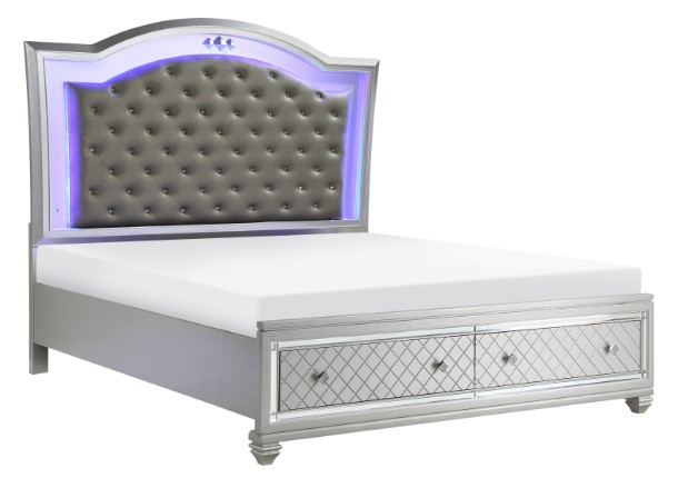 The headboard’s silver faux leather upholstered headboard panel is button tufted lending a classic accent to the look of the collection.