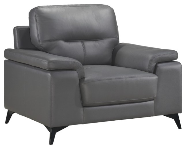 Styled for the modern home, the Mischa collection’s chair blends the luxurious feel of leather with the comfort of plush seating. The dark gray top grain leather cover, with faux leather, enhances the sleek profile of the collection.Read More