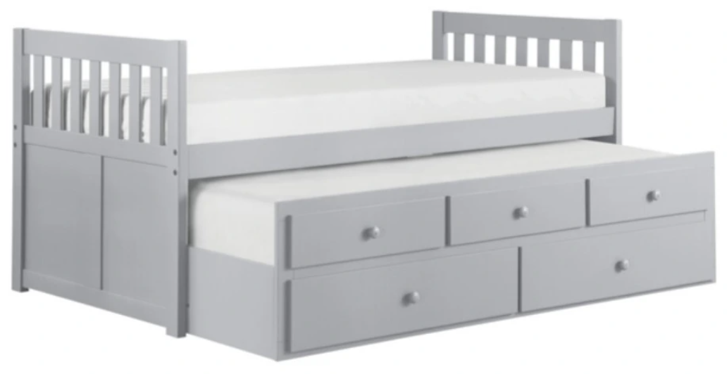 Maximizing sleep space is achieved with the stylish Orion Collection. This transitional twin over twin trundle bed – with two built-in storage drawers - is featured in a gray finish making it an appropriate choice for a number of youth bedroom settings. Also available: twin over twin, twin over full bunkbed, full over full bunkbed.Read More
