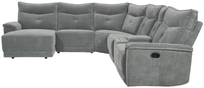 Providing ample seating in modern form is the Tesoro Collection. The classic sectional shape is comprised of a selection of individual components each providing functional complement to the overall design and covered in dark gray fabric providing a neutral palette for your decorative preferences. The manual reclining mechanism brings you to your desired position with a pull of the side mounted tab.