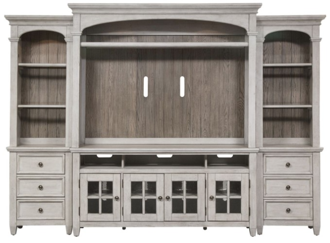Additional shelving within the hutch, LED touch lighting to illuminate the piece, bottom case dust proofing, is anchored by heavy tapered feet and accented by timeless antiqued brass knob hardware, and can accommodate most 65" TVs. With today's modern technology in mind, users can enjoy the convenience of the open compartment areas and wire management provisions to hide those pesky wires from your DVD player or gaming console of choice.