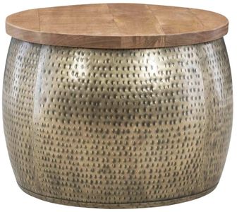 Add a unique conversation piece to your living room decor with this stylish, wood and metal storage drum. The hammered metal base boasts a gleaming finish for a touch of elegant allure. The removable mango wood top lifts to reveal a spacious storage compartment, making it easy to keep your space looking neat and put-together.Read More
