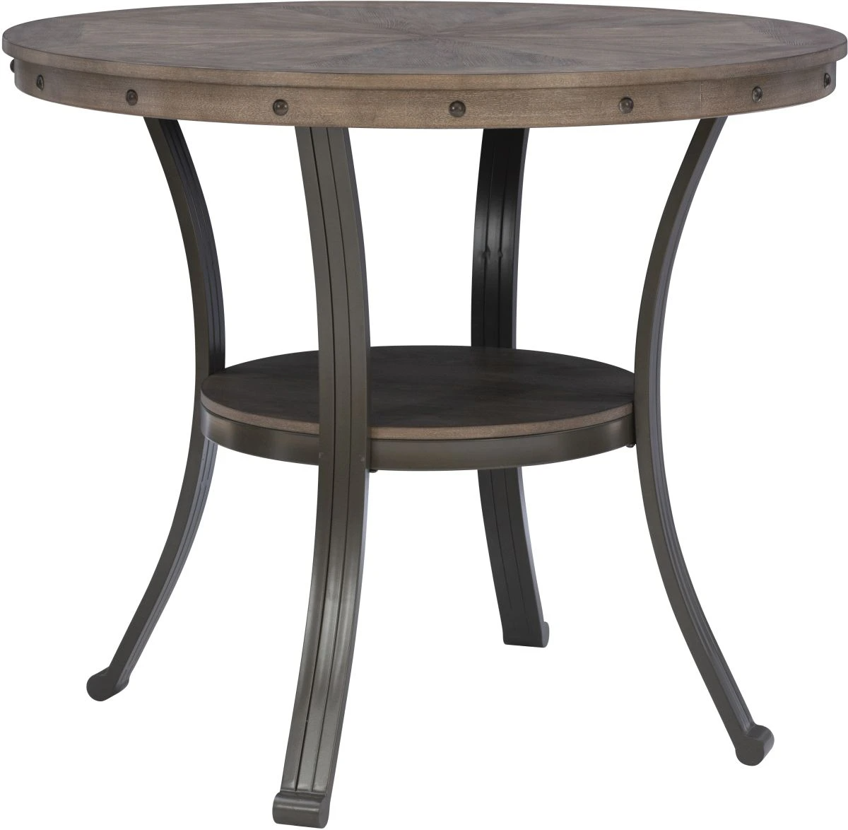 Mixing metal and wood in an updated industrial style provides a unique addition to your home. The round gathering height table features an inlay patterned top in ash veneer in a gray finish. This is the perfect table to gather at or as a casual dining solution for small space living.Read More