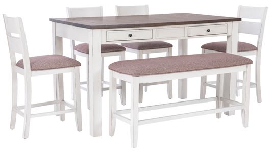 Create a warm and welcoming vibe in your kitchen or dining room with this farmhouse counter set. Upholstered in comfy brown linen look fabric, the bench and four matching stools ensure easy maintenance. Solid wood frames, finished in antique white, highlight natural wood grain patterns, forming a charming two toned look with the acacia veneer tabletop.Read More