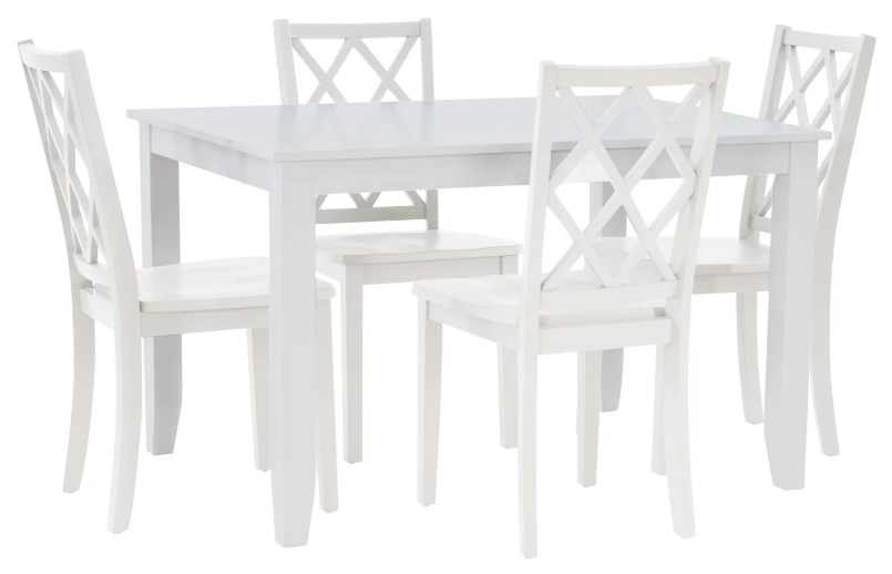 Create a charming, welcoming atmosphere in your dining space with this elegant 5-piece set. Featuring a sturdy rectangular table in faux leather white, this set is accented by 4 chairs in a striking graphite, gray, mint, white or multi-colored finish, offering a bold yet sophisticated contrast.Read More